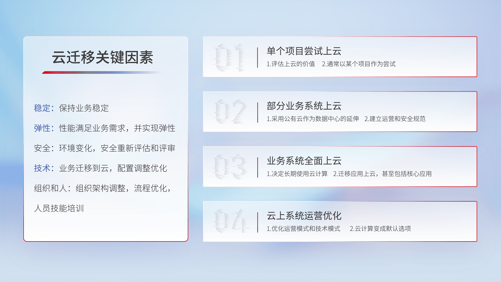 结合实际业务,,,从规划设计、、、、云平台选型、、、云原生改造、、数据迁移、、、集成交付,,,迁移全过程为客户识别最佳上云路径,,做好风险识别管理,,设计网络架构、、、身份权限、、、、安全审计合规、、操作审计、、、日志审计、、、监控告警策略、、、多站点容灾设计等,,,对云上基础设施进行整体规划,,,提升IT治理水平,,,以满足弹性、、、高可用、、、高性能的需求。。。